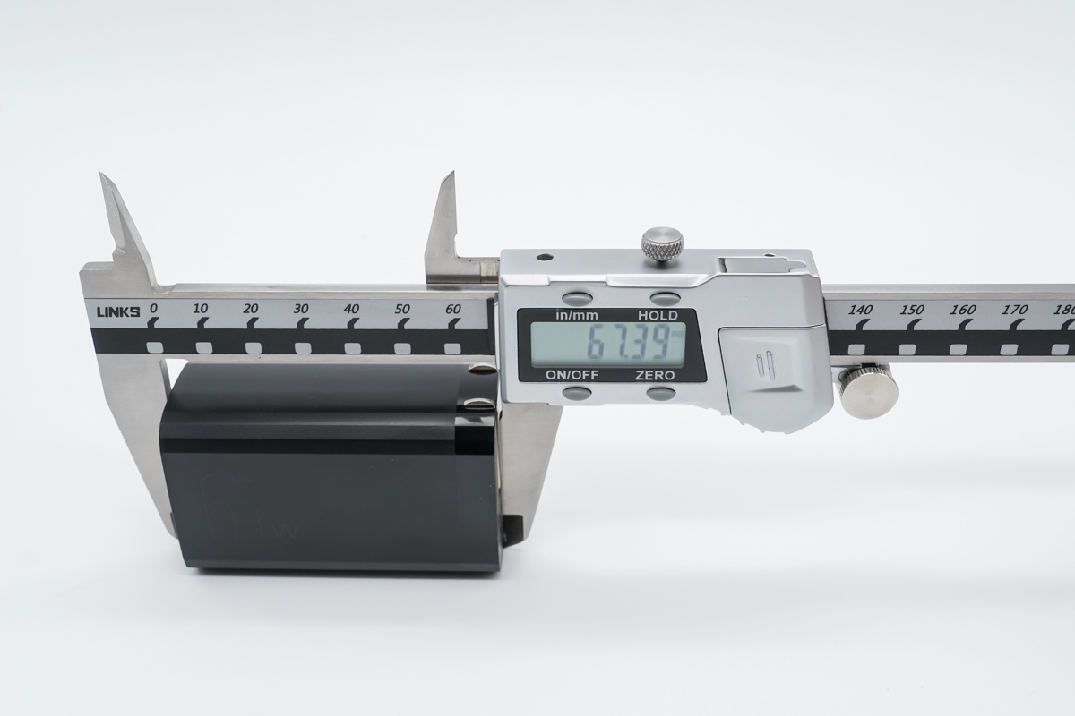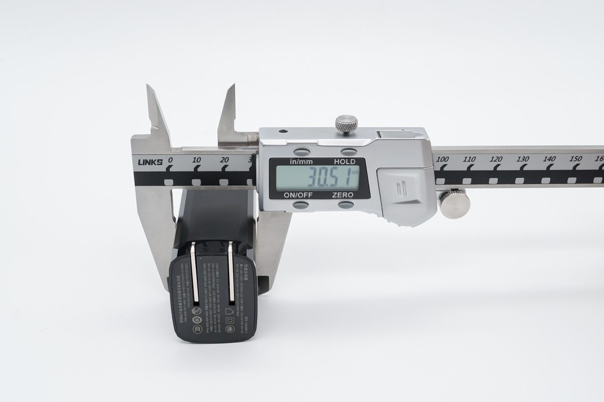 體積方面使用卡尺實測充電器的長度約為67.39mm(不含插腳)。