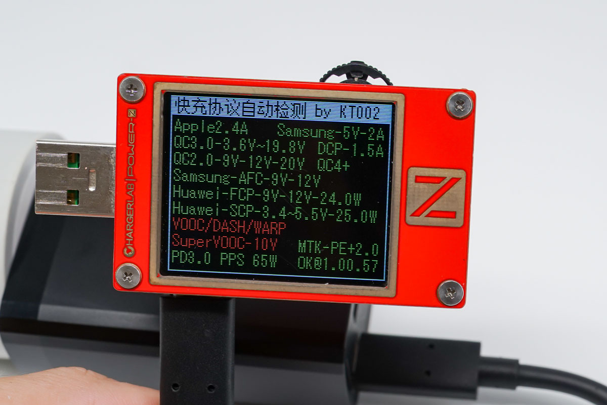 協議方面使用POWER-Z KT002讀取USB-C接口的快充協議,測試表的顯示屏幾乎全綠,綠色代表USB-C支持相應的快充協議。