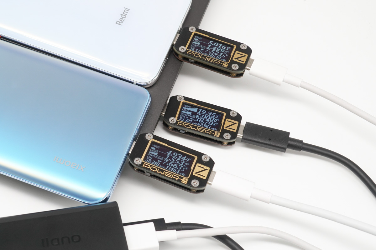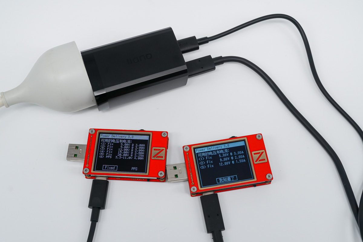 最后同時使用3個接口為3臺設備充電,功率分配規則為45W+5V3A。