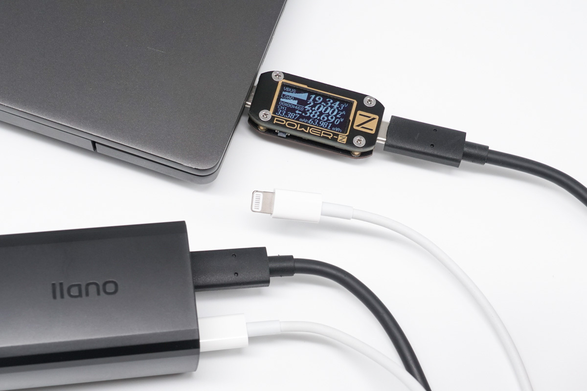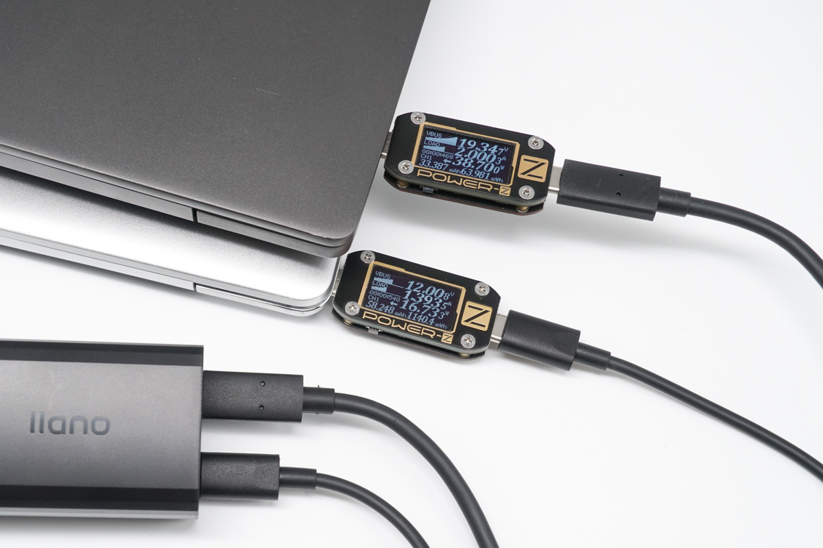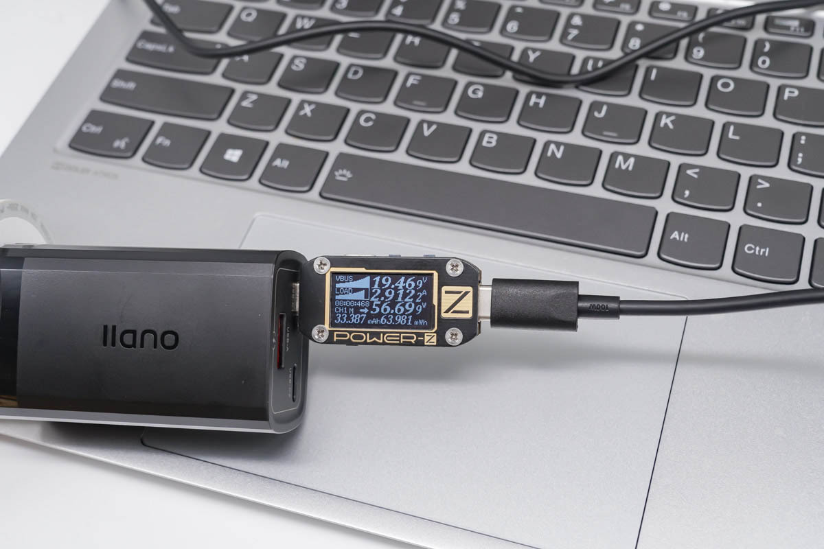 使用USB-C為筆記本充電,功率為38.69W,同時使用USB-A為手機充電,功率為14.52W。和雙C功率分配相同,USB-C和USB-A雙口同時輸出時依舊會遵循45W+18W的模式。
