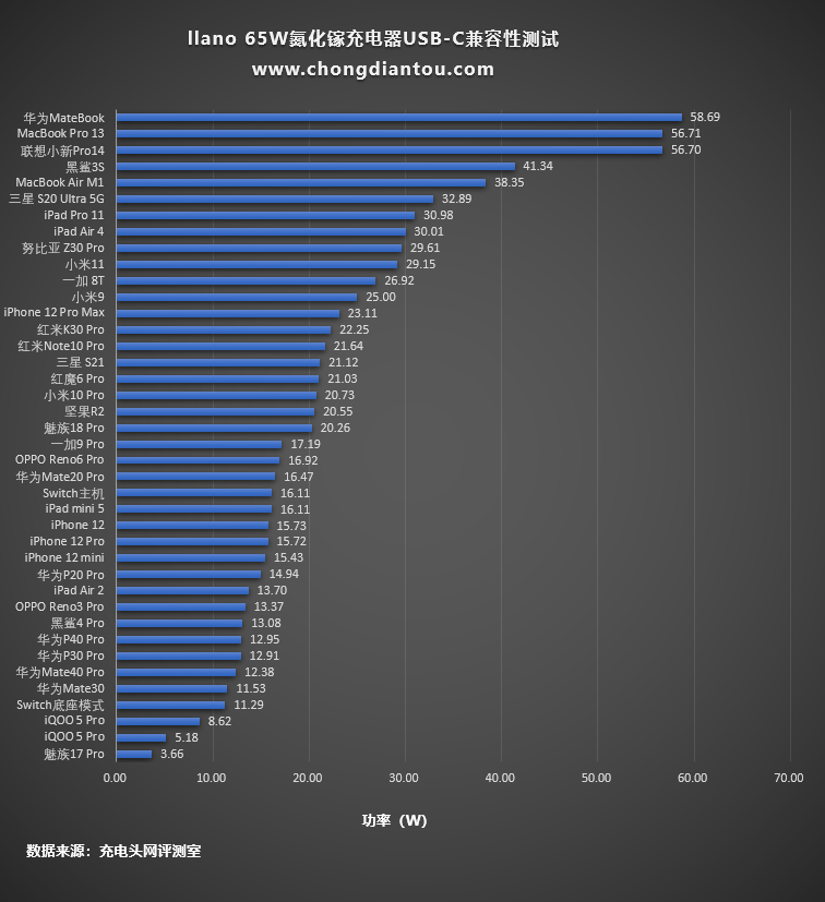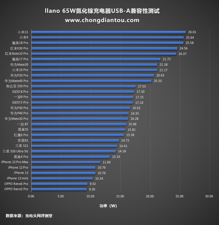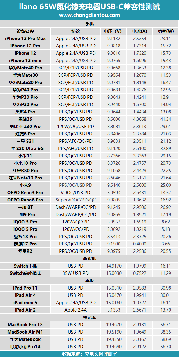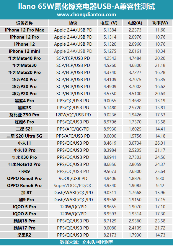將所有的測試數據匯總,整體來看快充兼容性不錯,為大部分設備充電都可以觸發快充,只是對魅族17 Pro的充電兼容性一般。