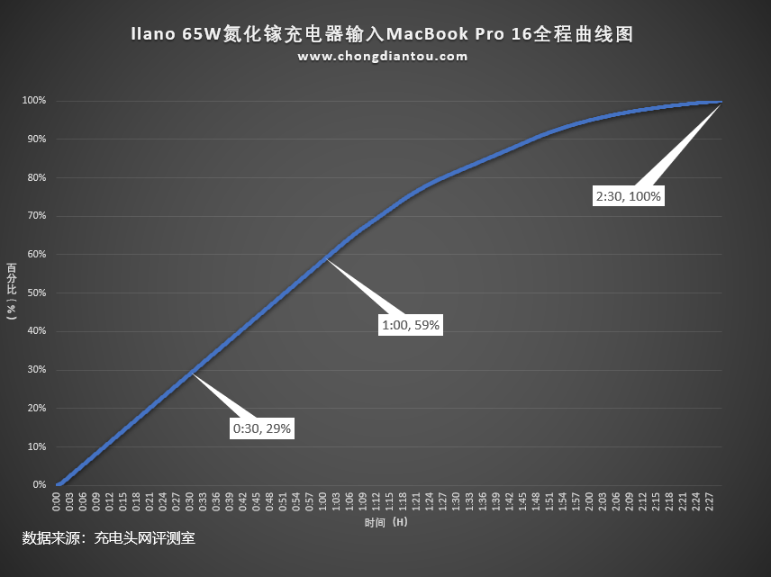 將充電全程繪制成曲線圖,可以得知llano綠巨能65W氮化鎵充電器為MacBook Pro 16半小時充電29%,1小時充電59%,完全充滿需要2小時30分。
