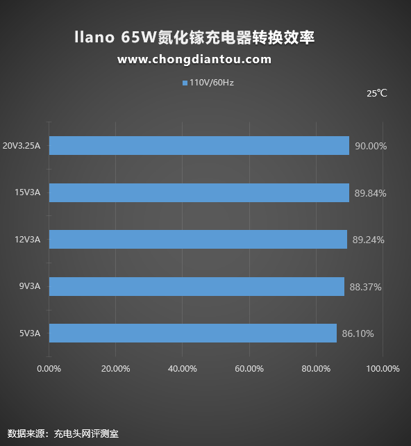 110V 60Hz下,充電器的轉換效率從86.1%到90%不等。