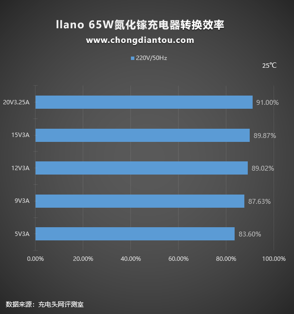 充電器本質上是一種轉換設備,過程中會有損耗,以熱量的形式散發出來。我們平時看充電器上面的參數輸出100W或者65W是充電器可以為設備提供的最大輸出功率,但充電器從插座上汲取的功率往往要更大一些,下面是llano綠巨能65W氮化鎵充電器在220V 50Hz和110V 60Hz交流輸入的情況下分別進行了轉換效率測試,測試結果如下: