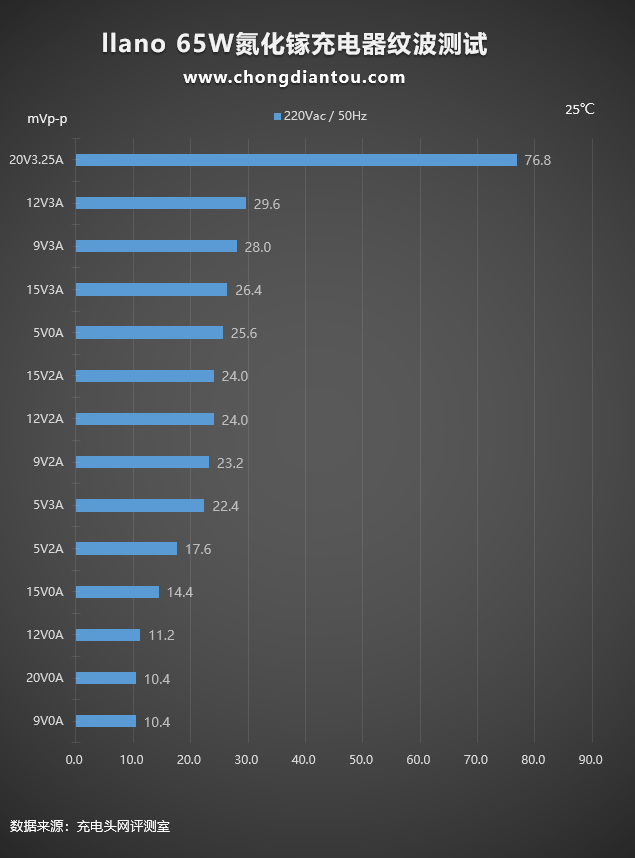 這是使用llano綠巨能65W氮化鎵充電器在220V 50Hz交流輸入下的紋波測試,紋波測試分為空載(柱狀圖中Y軸電流為0A)和重載(柱狀圖中Y軸電流為非0A)兩種。紋波最高為76.8mVp-p,充電器處于20V3.25A輸出狀態;最低為10.4mVp-p,充電器處于9V0A空載狀態。
