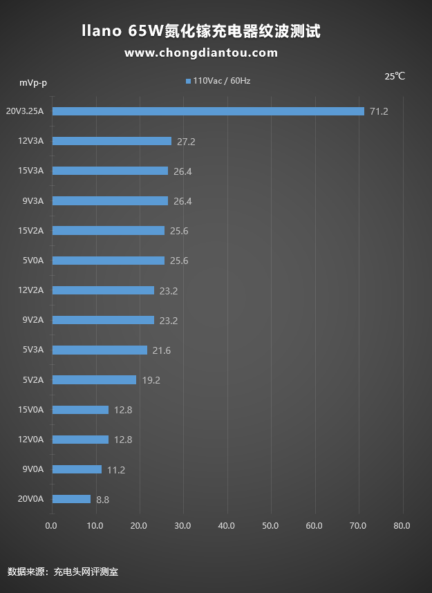 110V 60Hz下,紋波最高為71.2mVp-p,充電器處于20V3.25A輸出狀態;最低為8.8mVp-p,充電器處于20V0A空載狀態。