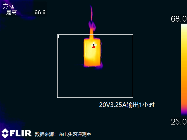 讓充電器以20V3.25A 65W的功率持續輸出1小時后采集到充電器表面的最高溫度為66.6℃。