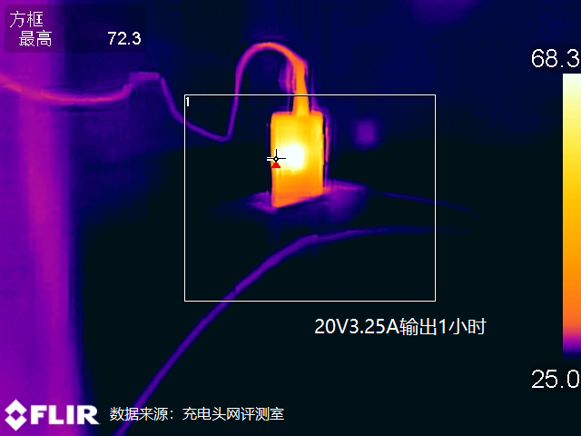 最后還對充電器的溫控方面進行了測試,測試在25℃的恒溫箱內進行,測試條件為以20V3.25A 65W的功率持續滿載輸出1小時后使用熱成像儀對充電器表面的溫度進行采集。