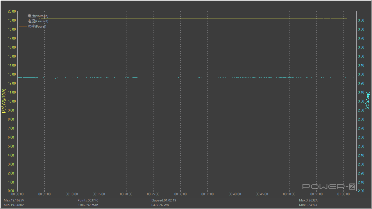 在測試溫度時也同步測試了充電器是否可以穩定輸出,按照額定功率20V 3.25A 65W滿載對充電器進行穩定性測試,測試時間為一小時,測試過程中電壓值呈水平直線,無明顯波動情況,長時間滿載比較穩定。