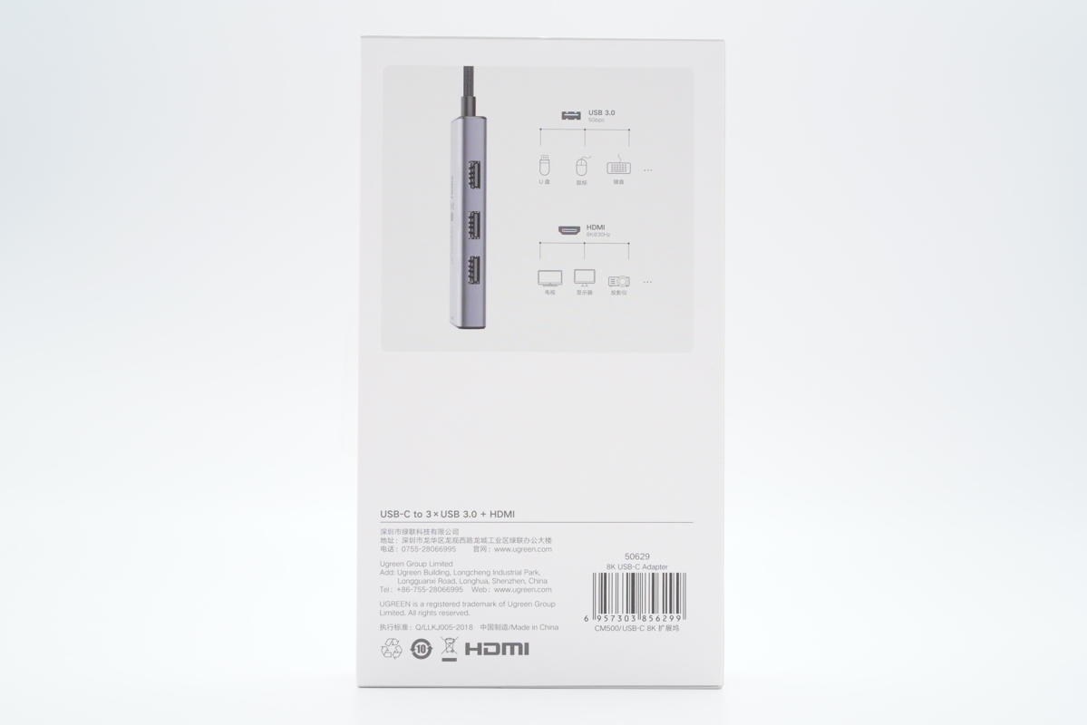 機身背面印有產品名稱、型號CM500、制造商深圳市綠聯科技有限公司等信息,功能接口旁印有HDMI、USB3.0提示標識。