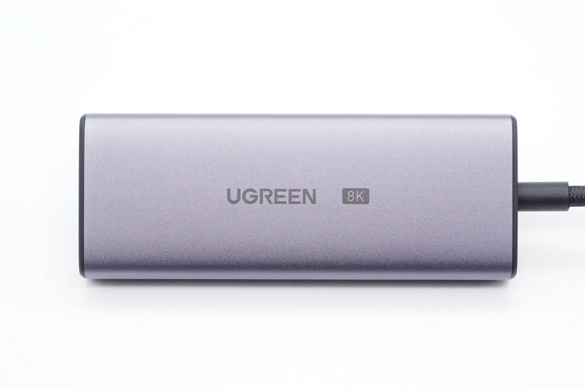 拓展塢本體部分也是采用鋁合金材質,兩端外殼為塑料。鋁合金外殼表面噴砂處理,手感好顏值高。機身中心印有UGEEEN品牌logo以及8K標識。