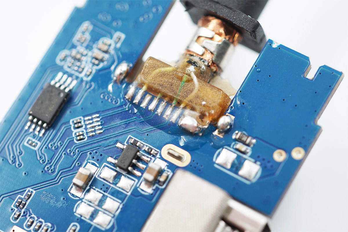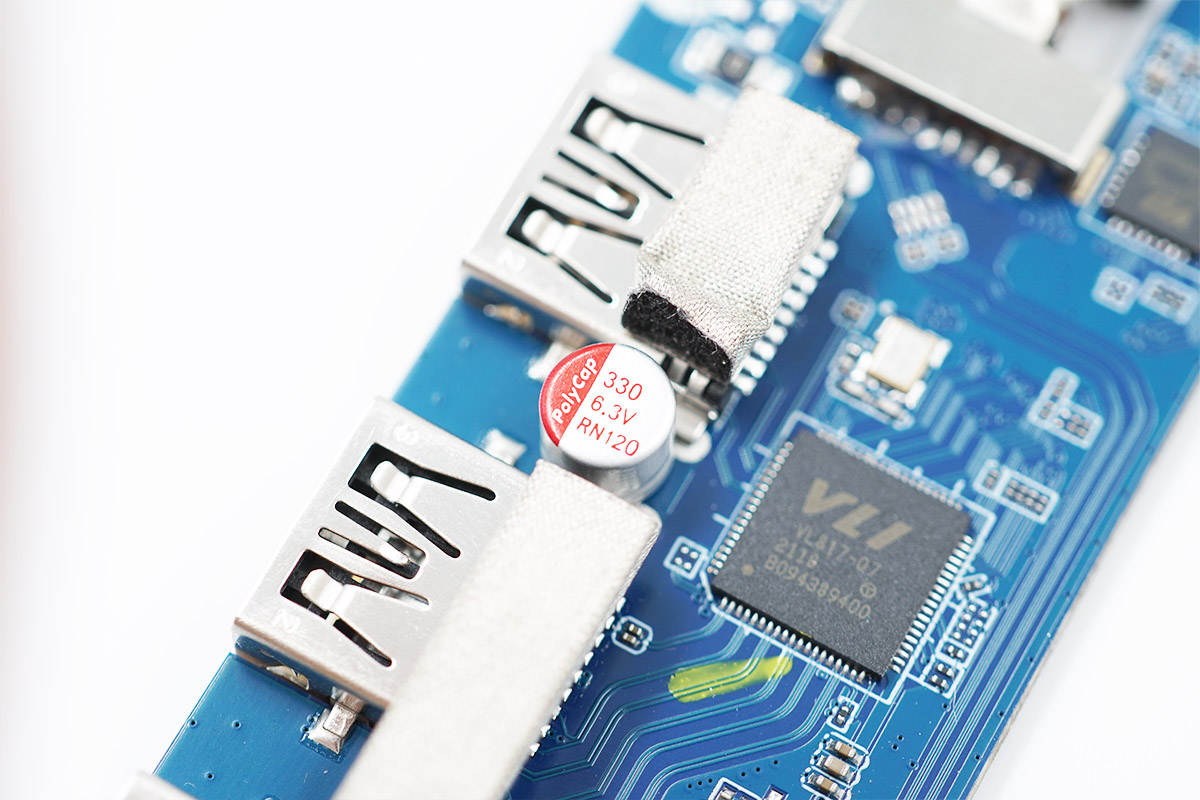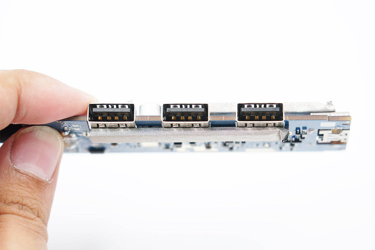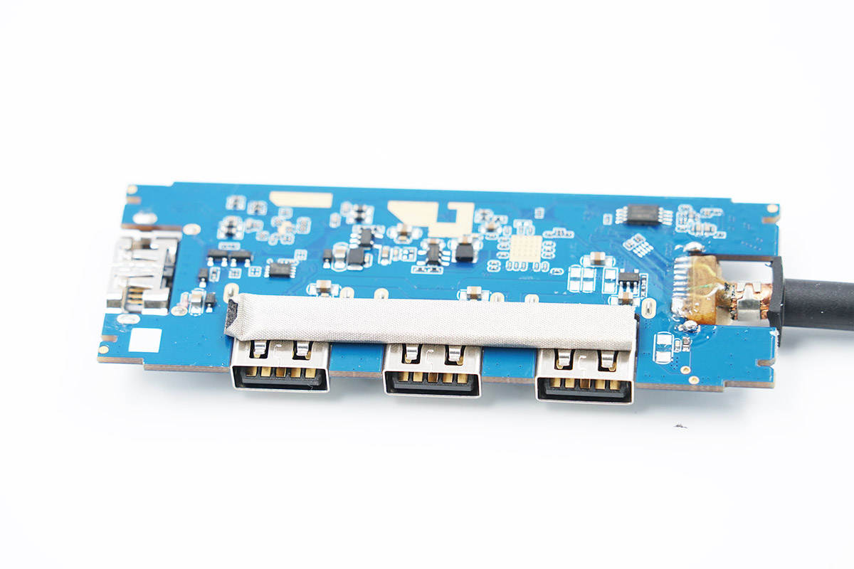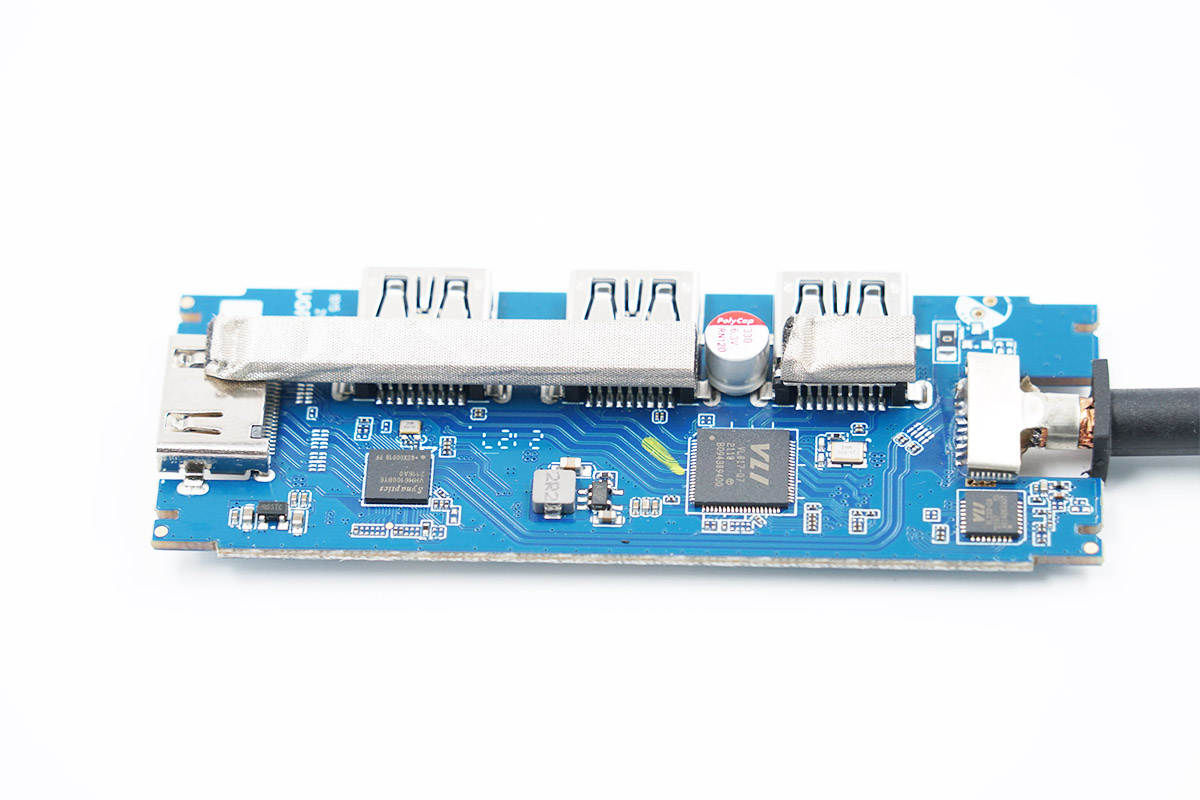 產品的功能接口沉板過孔焊接,降低機身厚度,此外由于擴展塢采用金屬機身殼,接口還都貼有導電布接地,細節講究。
