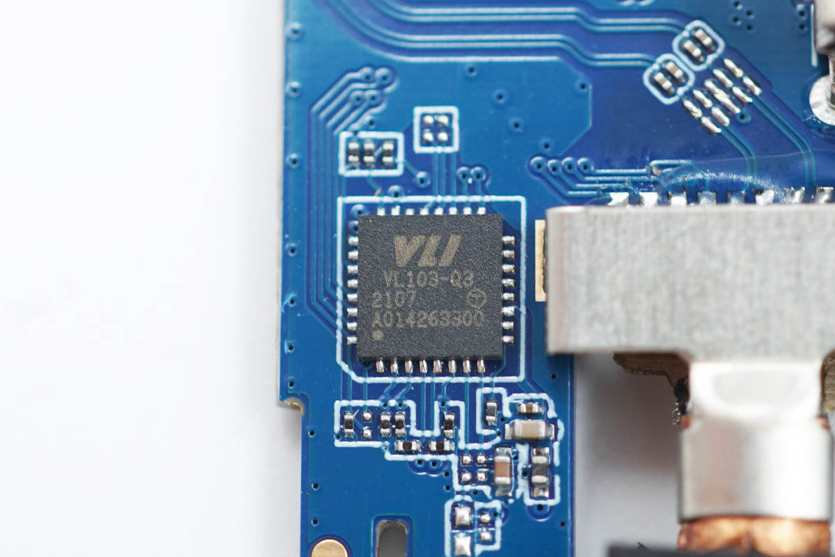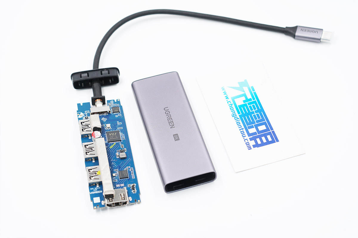 綠聯這款8K擴展塢自帶USB-C編織線纜,方便耐用。擴展塢機身采用鋁合金材質,表面噴砂處理,不僅手感好保護性也強,此外還有利于散熱。充電頭網拆解發現,擴展塢采用了知名廠商威鋒電子的VL103-Q3控制器以及VL817-Q7集線器芯片,新思 VMM6100BYE的視頻轉換芯片等。