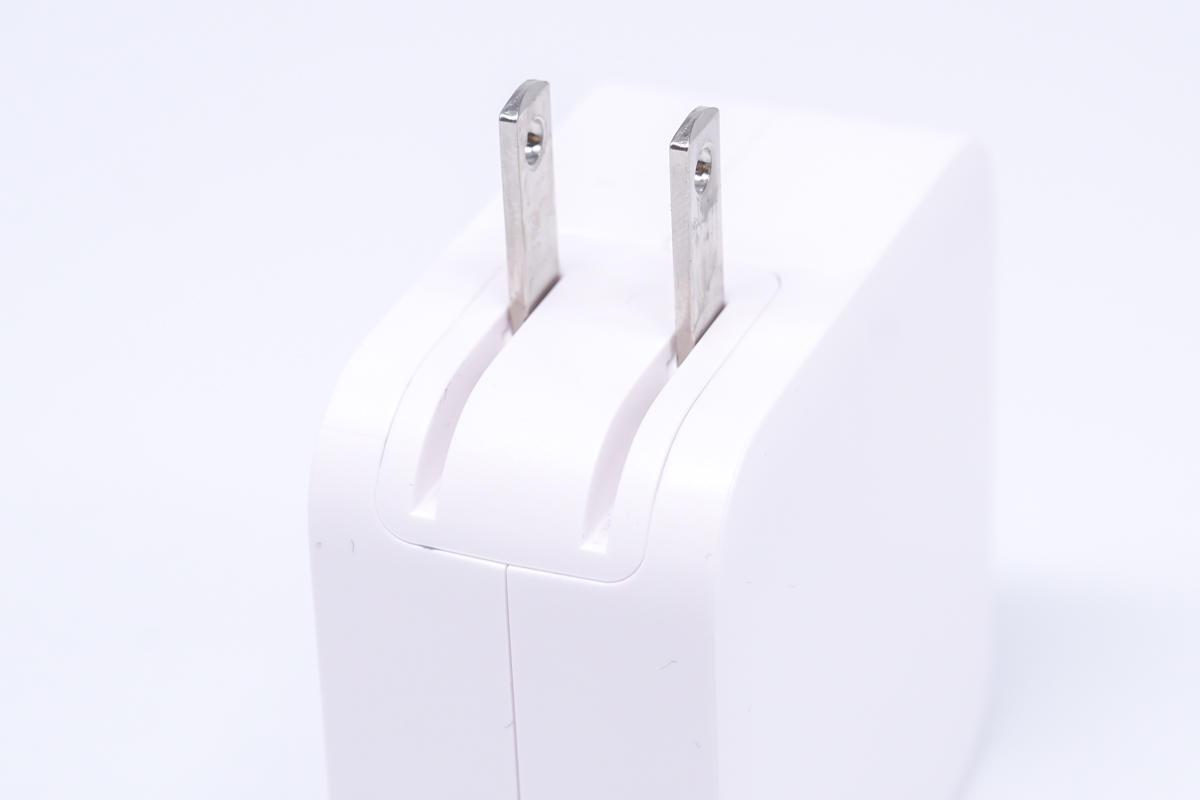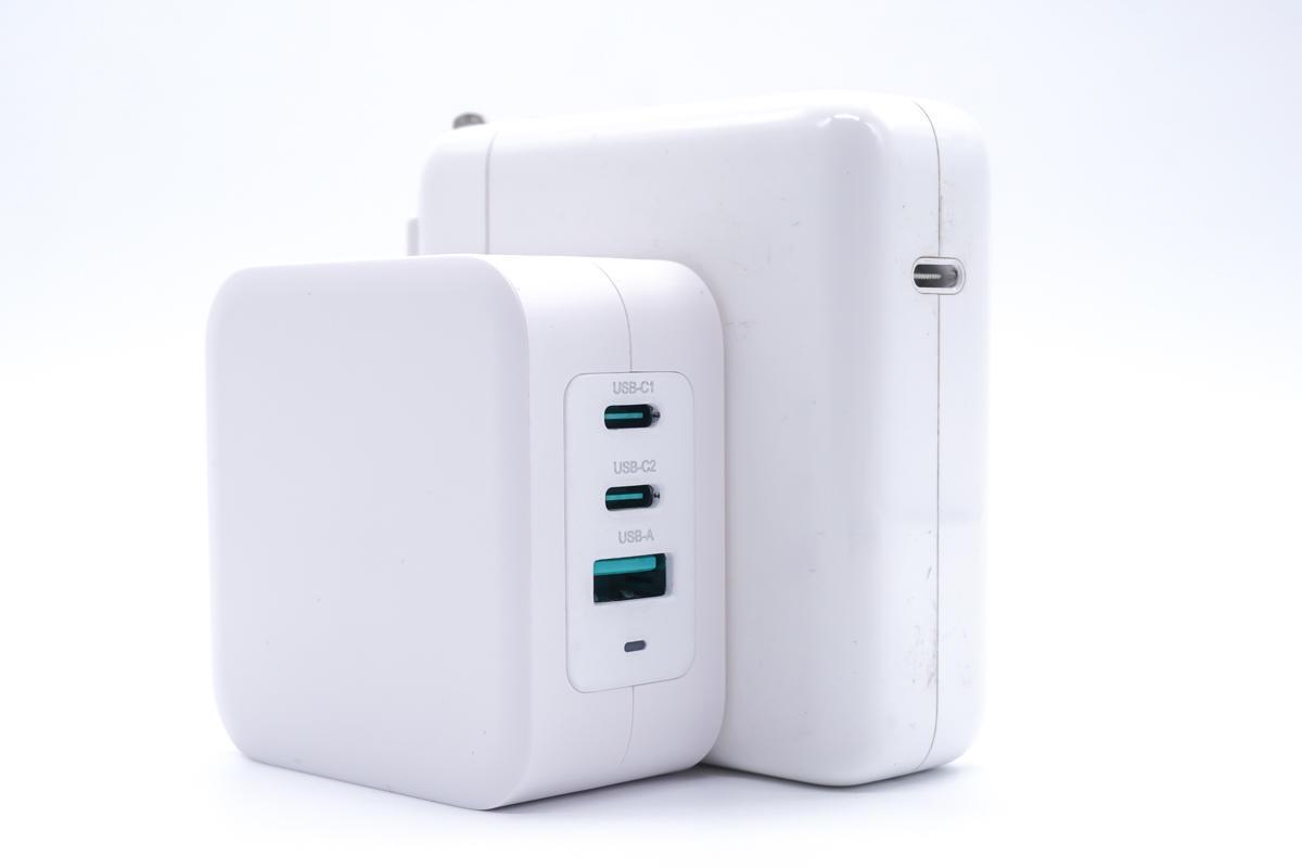 和蘋果96W充電器對比一下,功率比后者大,接口比后者多,體積比后者小。