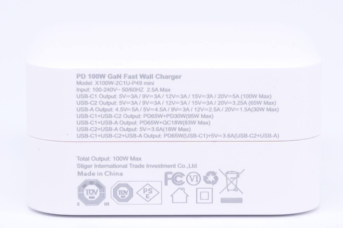 側面殼體印著具體的參數信息,斯泰克100W充電器的具體型號為X100W-2C1U-P49 mini,支持100-240V的寬電壓輸入,總輸出功率為100W,中國制造。
