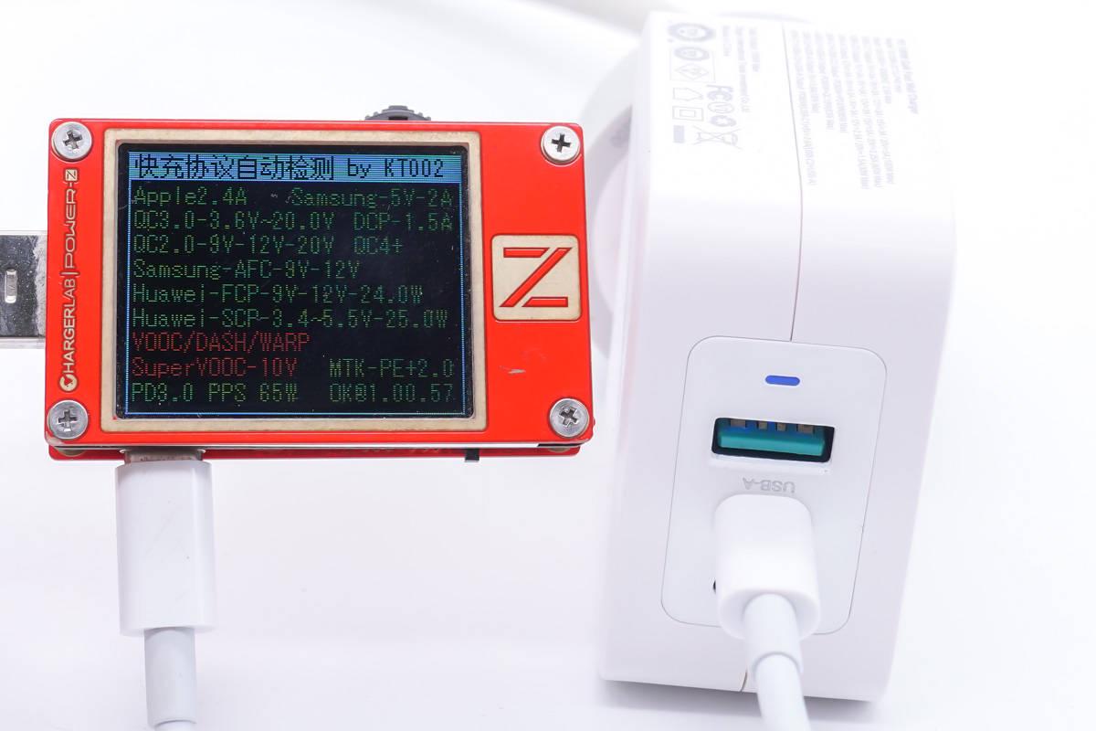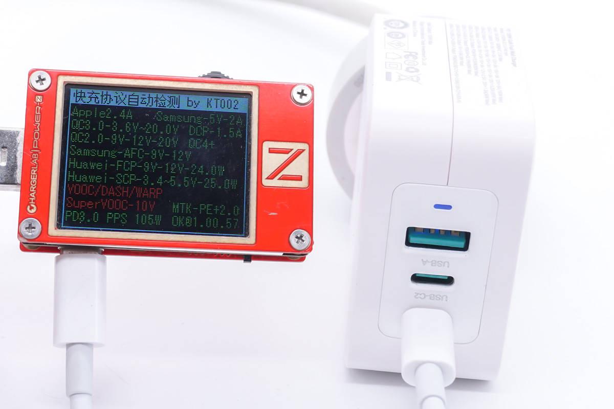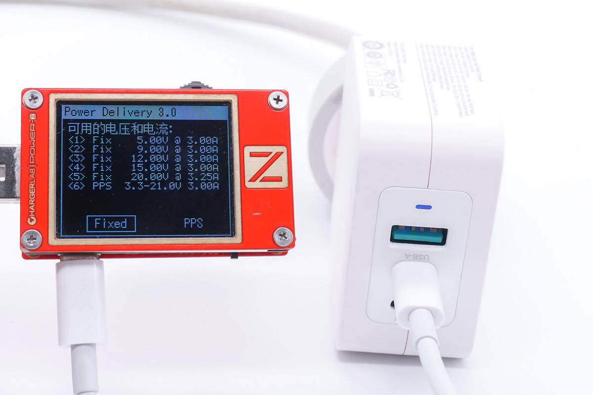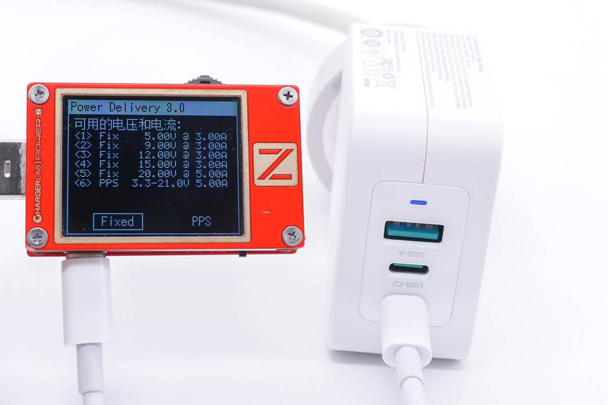 首先使用ChargerLAB的POWER-Z KT002讀取USB-C1接口的快充協議,實測支持PD、PPS、Apple2.4A、QC2.0、QC3.0、QC4+、AFC、FCP、SCP、PE快充協議。