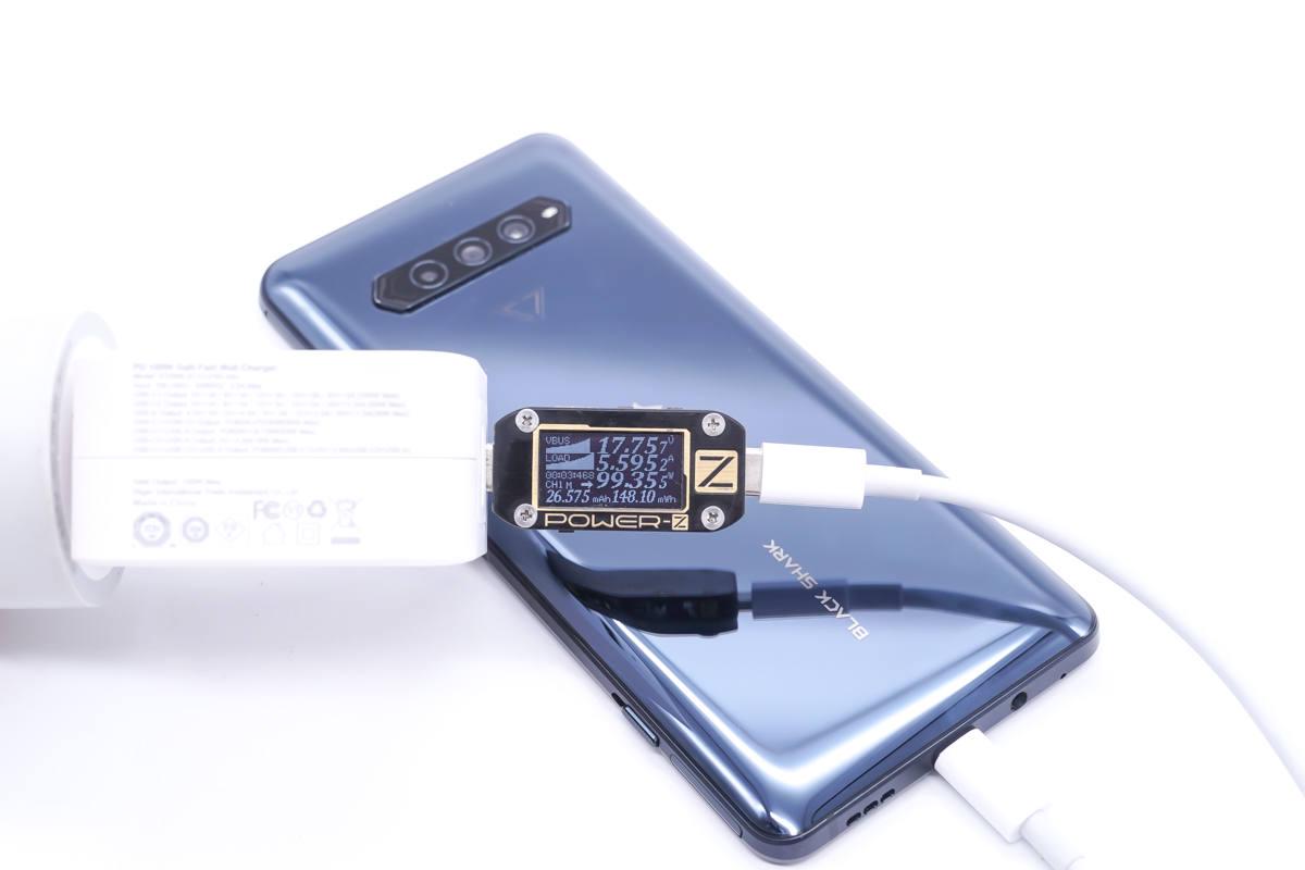 首先來看USB-C1,使用USB-C1為黑鯊4 Pro充電,功率為17.75V 5.59A 99.35W,成功觸發黑鯊4 Pro的百瓦快充。