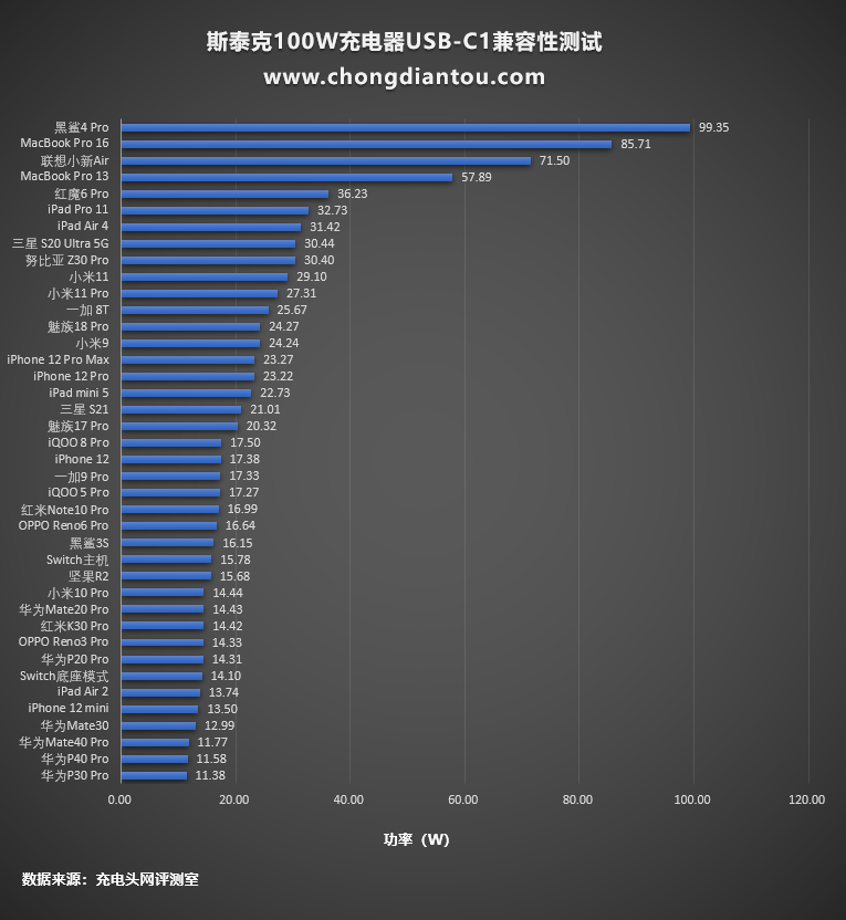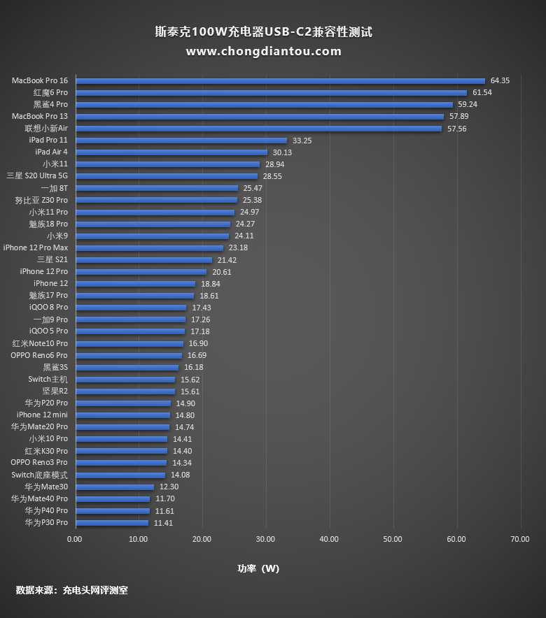 柱狀圖部分,MacBook Pro 16的功率最高,黑鯊4 Pro和紅魔6 Pro緊隨其后,其他設備處于正常的快充狀態。