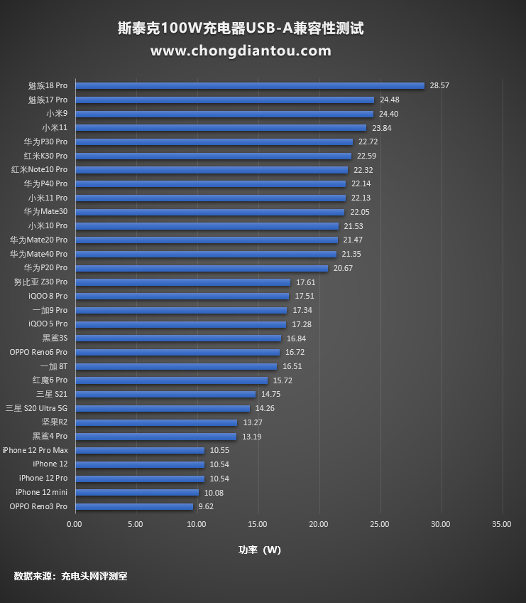 柱狀圖這里可以看出魅族18 Pro的功率最高,達到了28.57W。其他機型處于正常的快充狀態。