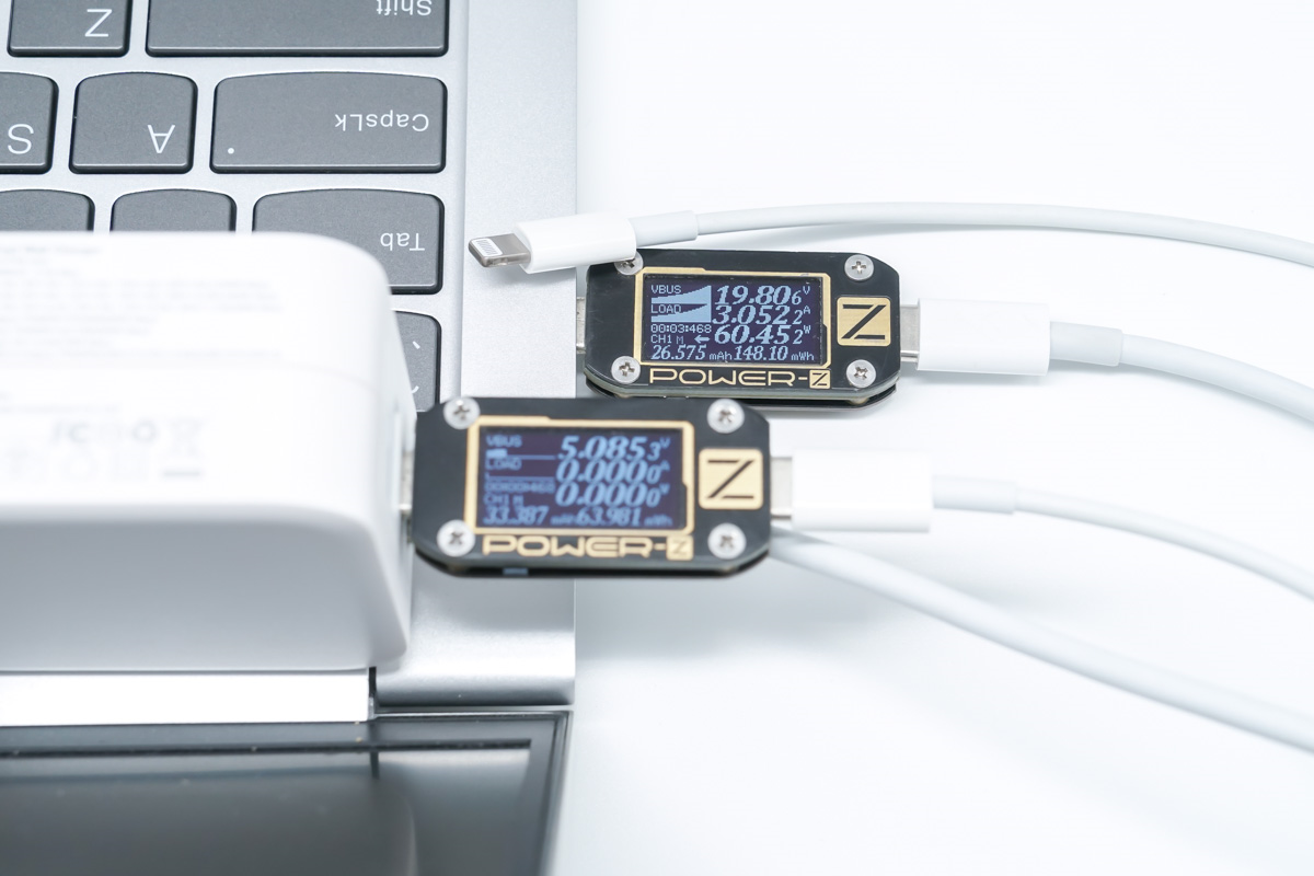 使用USB-C1為筆記本充電,同時使用USB-C2連接C to Lightning快充線空載,實際測得充電器依舊會默認雙口同時輸出,這一點使用C to Lightning快充線的用戶需要注意一下。