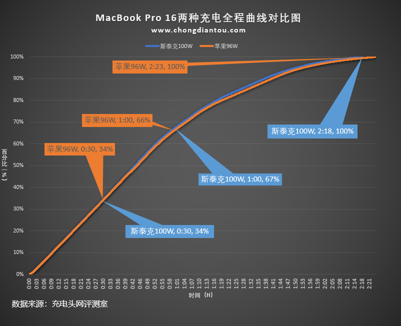 從兩條曲線圖可以清楚的看到幾乎處于重合的狀態,也就是說使用斯泰克100W氮化鎵充電器為MacBook Pro 16充電可以獲得和原裝相同的快充體驗。