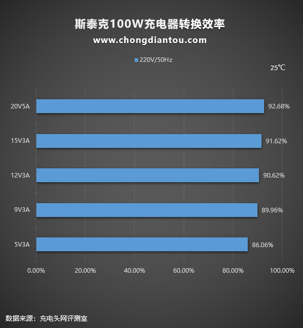 充電器本質上是一種轉換設備,過程中會有損耗,以熱量的形式散發出來。我們平時看充電器上面的參數輸出100W或者65W是充電器可以為設備提供的最大輸出功率,但充電器從插座上汲取的功率往往要更大一些,下面是斯泰克100W氮化鎵充電器在220V 50Hz和110V 60Hz交流輸入的情況下分別進行了轉換效率測試,測試結果如下: