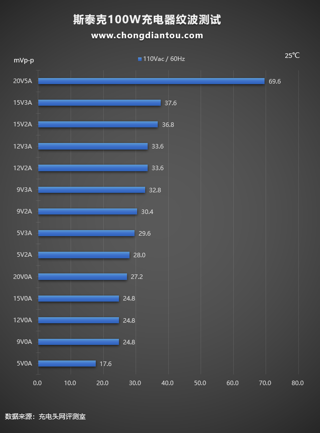 這是使用斯泰克100W氮化鎵充電器在220V 50Hz交流輸入下的紋波測試,紋波測試分為空載(柱狀圖中Y軸電流為0A)和重載(柱狀圖中Y軸電流為非0A)兩種。紋波最高為68mVp-p,充電器處于20V5A輸出狀態;最低為16mVp-p,充電器處于5V0A空載狀態。