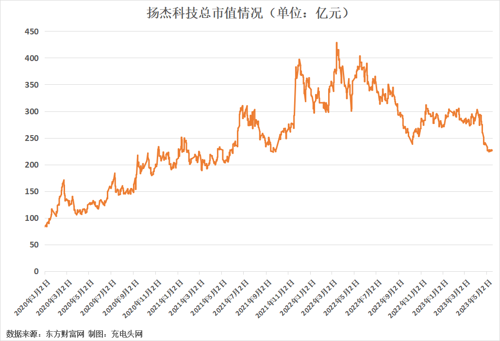 從揚(yáng)杰科技近幾年市值情況來(lái)看,2022年3月16日,揚(yáng)杰科技市值達(dá)到最高428.37億元;2020年1月2日最低為83.57億元。截至2023年5月18日,揚(yáng)杰科技總市值為226.6億元。