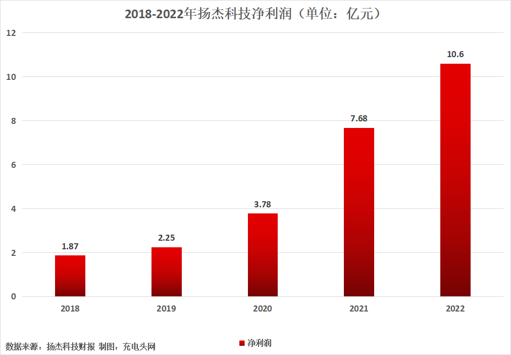 2018—2022年,揚(yáng)杰科技凈利潤(rùn)分別為1.87億元、2.25億元、3.78億元、7.68億元、10.6億元,同比增長(zhǎng)-29.70%、20.16%、68.00%、103.06%和38.02%。