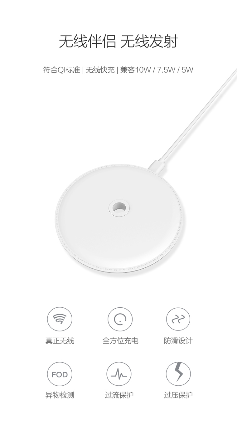 這款無線充電器叫UIBI柚比 T1無線充電發射器,型號:UIBI-T1-G,支持Qi無線標準,可以給具備Qi無線標準的設備進行充電,共有5W、7.5W、10W三種功率輸出。除此之外,還具備異物檢測、過流保護、過壓保護、過溫保護四大安全防護。