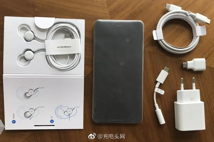 從圖片上看,分別有USB Type-C耳機、Pixel 3 XL 、雙頭USB Type-C數據線、USB Type-C轉3.5mm音頻接口線、USB-C OTG轉接頭、歐規插頭充電器。