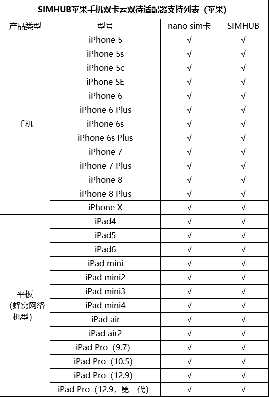 SIMHUB支持中國移動、中國聯通、中國電信三大運營商,其中中國電信需要iPhone三網通機型支持。購買一個SIMHUB,就能在三大運營商之間自由切換。 這些蘋果設備可以用 據統計,目前蘋果旗下支持SIMHUB的iPhone多達數十款,涵蓋了iPhone5及以后發布的所有機型;而2018年即將發布的三款iPhone也有望全部支持。除此之外,支持蜂窩網絡的iPad也同樣支持SIMHUB,動手能力強的小伙伴可以在iPad上對SIMHUB進行深入研究。 SIMHUB除了適用于iPhone機型,安卓手機中的單卡機型也可以通過SIMHUB擴展支持雙卡,如黑莓KEYone、谷歌Pixel2、Pixel3等熱門旗艦手機。 SIMHUB蘋果手機雙卡云雙待適配器項目眾籌還有數天結束,感興趣的小伙伴可前往:京東眾籌參與。