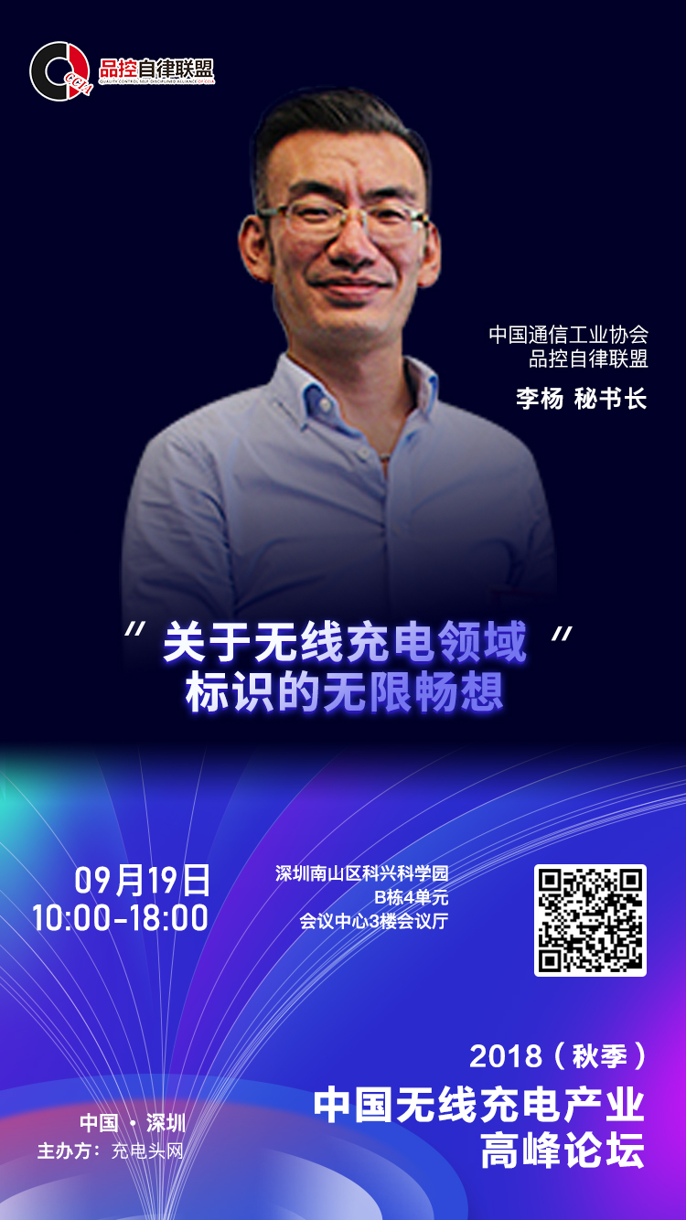 中國通信工業協會品控自律聯盟秘書長 李楊,本次峰會的演講主題是《關于無線充電領域標識的無限暢想》。