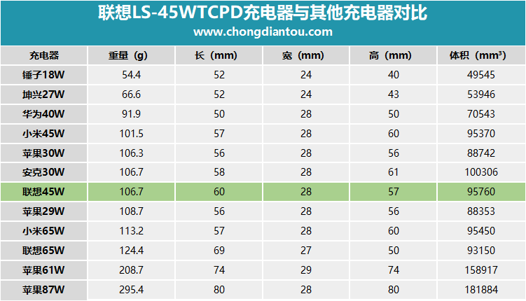 從測試來看,聯(lián)想LS-45WTCPD充電器優(yōu)缺點(diǎn)如下: