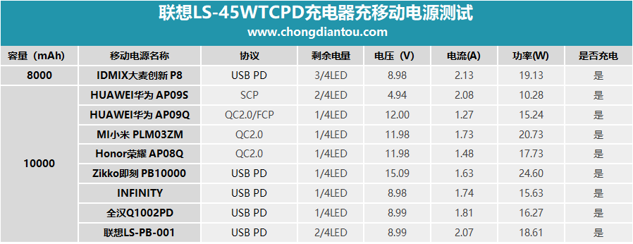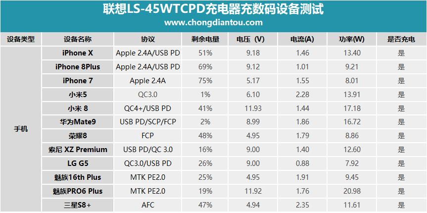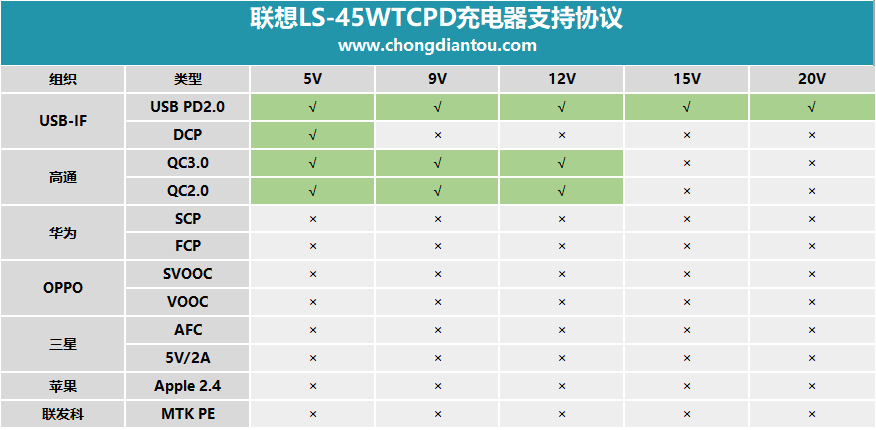 聯(lián)想LS-45WTCPD充電器支持協(xié)議一覽。