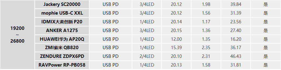 在充19200~26800mAh移動電源時,同樣是可以給支持USB PD協(xié)議的移動電源快充,尤其是Jackery、mophle、IDMIX、ANKER、ZENDURE、RAVpower這幾款移動電源,都是20V的高壓充電,ZENDURE更是達(dá)到了46W,充電速度很快。