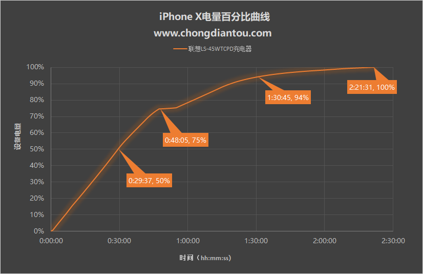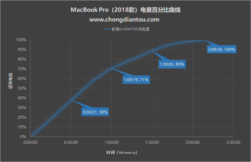 兼容性、最大輸出、溫度控制、效率轉(zhuǎn)化測試做完了,但是在實(shí)際的使用當(dāng)中表現(xiàn)會如何呢?為此,小編分別用聯(lián)想LS-45WTCPD充電器對MacBook Pro 13寸 2018款和iPhone X進(jìn)行了0-100%充電測試。