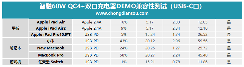 可支持iPad Pro(10.5英寸)USB PD快充,支持iPad Air以及iPad Air2滿速充電;支持筆記本電腦方面,支持MacBook Pro、New MacBook、小米筆記本USB PD快充;還可支持任天堂Switch游戲機USB PD快充,充電速度與原裝充電器相當。