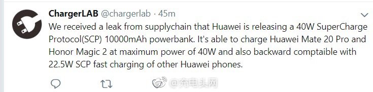 除此之外,這么大功率主要為Mate 20 Pro以及榮耀Magic 2量身打造,目前華為這兩個機(jī)型均支持40W超級快充。