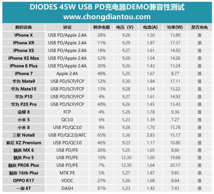 在兼容性測(cè)試中,我們一共測(cè)試了21款手機(jī),通過(guò)上面這張圖表,我們可以了解到,DIODES這套45W USB PD快充充電器DEMO板可以支持全系iPhone X快充,支持華為主流旗艦手快充,同時(shí)也可以兼容小米、魅族、三星等手機(jī)充電,兼容性很好。