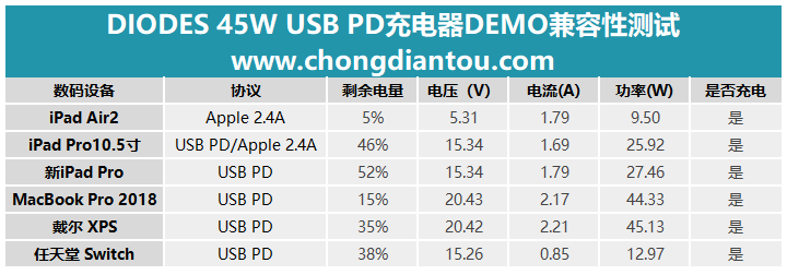 測(cè)試結(jié)果顯示,DIODES這套45W USB PD快充充電器對(duì)蘋(píng)果最新的iPad Pro、MacBook Pro、戴爾XPS、任天堂Switch都可以實(shí)現(xiàn)USB PD快充。