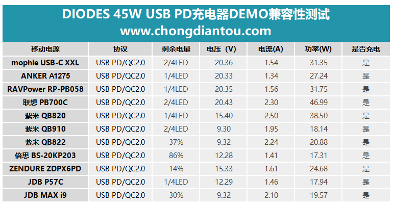 測(cè)試結(jié)果顯示,DIODES 這套45W USB PD3.0快充充電器參考設(shè)計(jì)對(duì)市面上主流的移動(dòng)電源都能實(shí)現(xiàn)快充。
