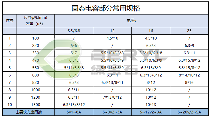 綠寶石12V系列產品多達12款以上,提供的容量范圍為180-1200uF(或以上),可以應用于高通Quick Charge、華為FCP、MTK PE 2.0等快充技術,在充電器的應用中可以實現9V 2A的輸出需求。綠寶石這類固態電容產品已經成功應用在華為、魅族等終端品牌的充電器上。