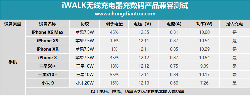 小編還測試了其他幾款支持無線充電的手機,并記錄了iWALK無線充電器當前的輸入端功率,做成了表格方便大家觀看。