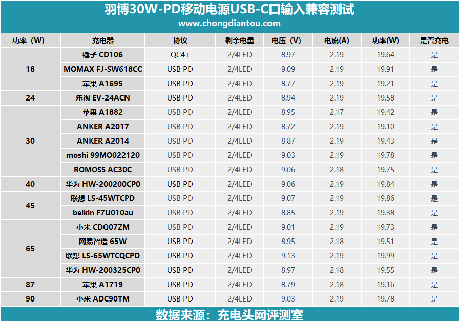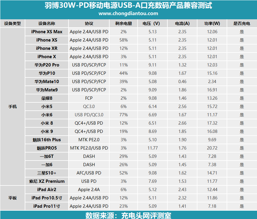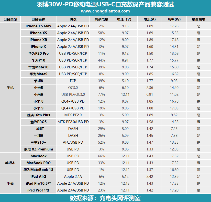 小編還測試了其他設備,做成表格方便大家觀看。從圖表中可以看出來,支持PD快充的數碼產品均能跟羽博移動電源握手PD協議,開啟PD快充。一些不支持PD的設備也能正常充電。
