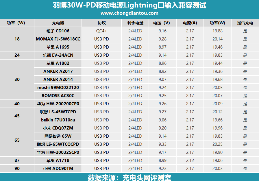 小編把Lightning輸入接口的兼容性情況匯聚成表格,可以發現Lightning的兼容性情況也非常好,以上測試的PD充電器均能給它進行快充。