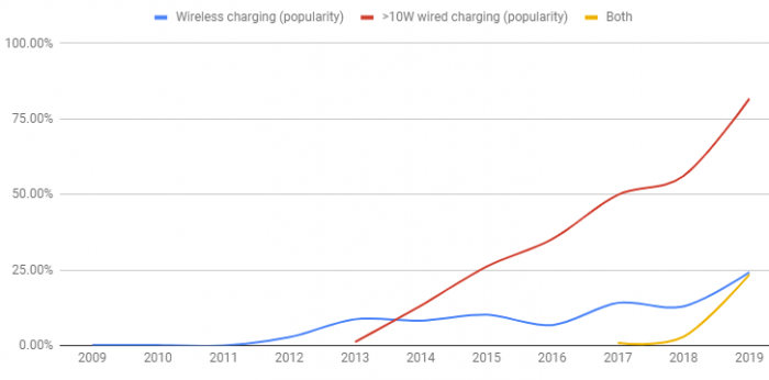 雖然無線充電起步較早,但它普及得很慢。正如下表所示,有線快充在推出后不久就取代了它,成為當今最流行的手機功能。