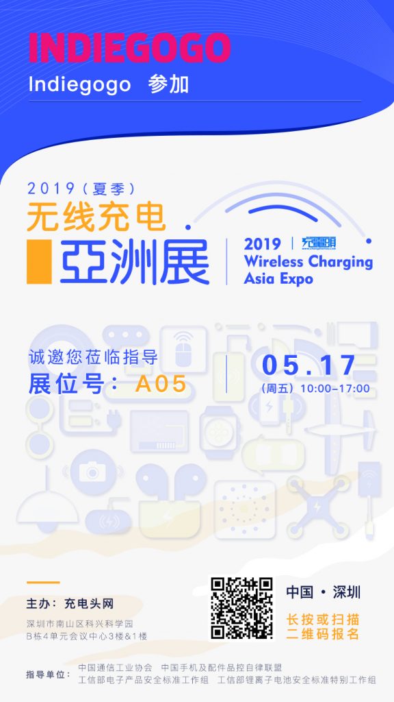 Indiegogo將在5月17日出席參加:2019(夏季)無線充電亞洲展,展臺設在A05,歡迎大家前來咨詢!