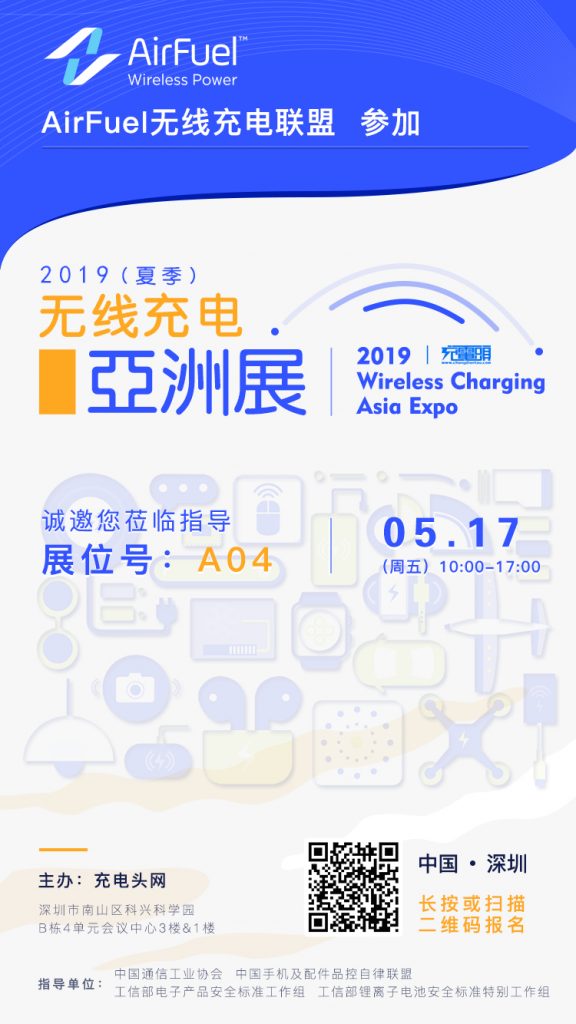 AirFuel無線充電聯盟將在5月17日出席參加:2019(夏季)無線充電亞洲展,展臺設在A04,歡迎大家前來咨詢!