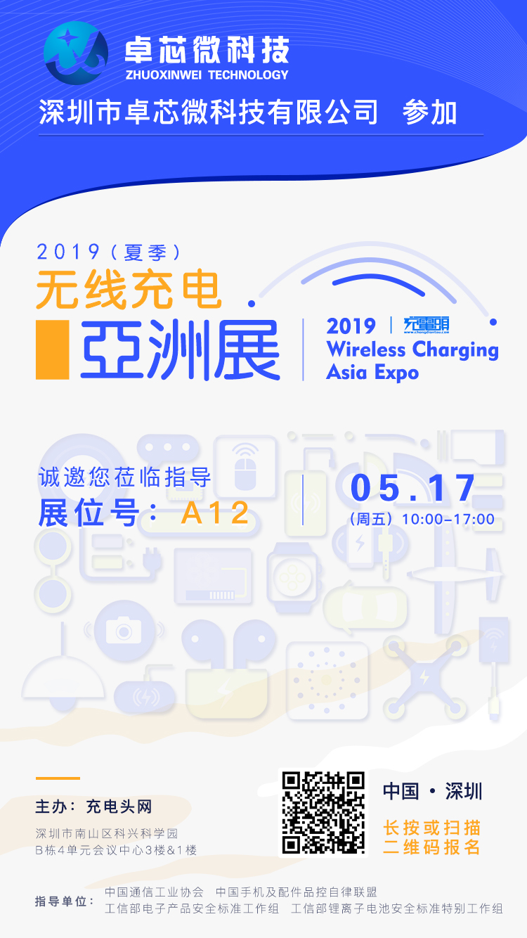 卓芯微科技將在5月17日出席參加:2019(夏季)無線充電亞洲展,展臺設(shè)在A12,歡迎大家前來咨詢!